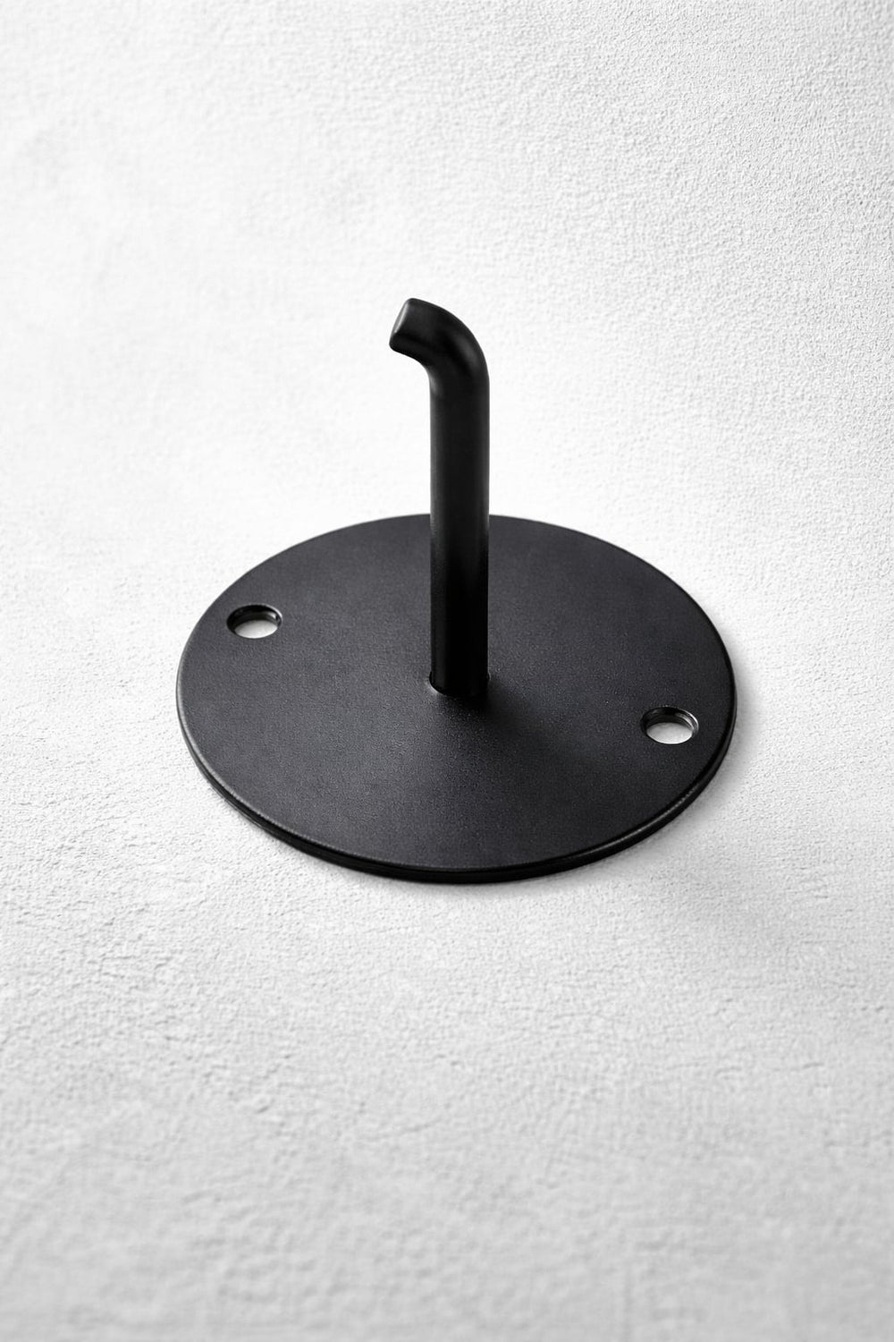 Dieser schwarze Stahlhaken ist eine funktionale und ästhetische Lösung zum Aufhängen von Gegenständen im Haushalt und besticht durch sein schlichtes und zeitloses Design.